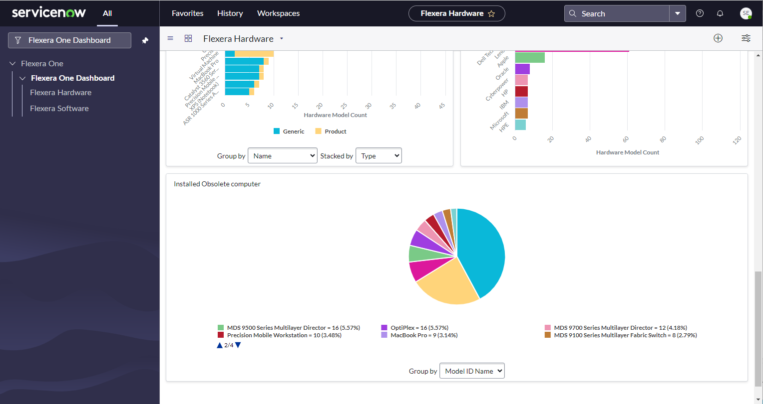 The Flexera Hardware dashboard includes 9 different interactive charts to visualize your normalized hardware models, computers by class and by manufacturer, your top ten normalized hardware models and network gear models, your installed obsolete computers, and more.