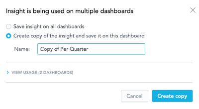 5. If the insight is included on multiple dashboards and you want to update it only for the current dashboard, select Create copy of the insight and save it on this dashboard, type a new name and click Create a copy.