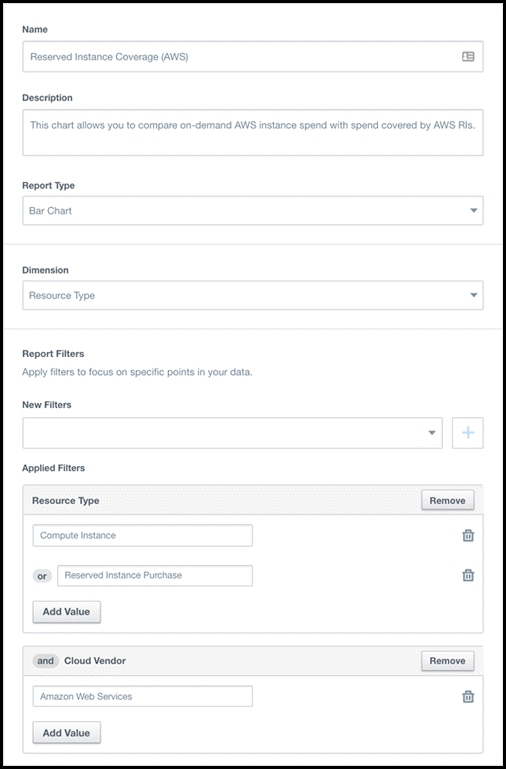 To set up these AWS RI Coverage reports, use a bar chart to see monthly data and a line chart to see daily data. Simply change the report type between bar, line, or table to see these variations.