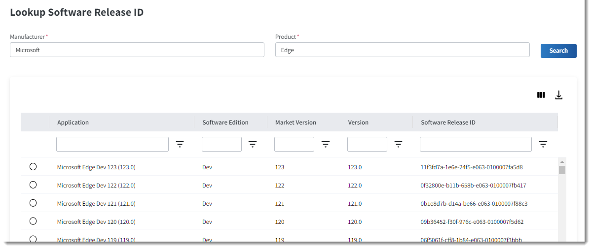 - Click Select to return to the bucket definition. The Software Release ID field displays the correct Technopedia release ID for the application you selected.